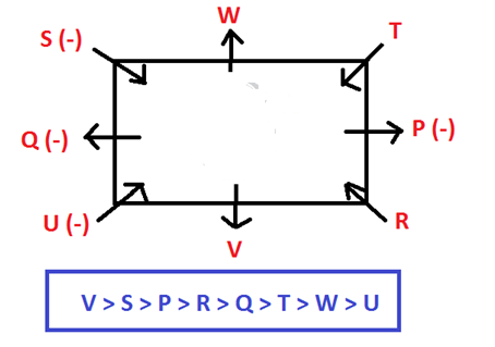 P, Q, R, S, T, U, V and W are sitting around a square table in such a way that four of them sit at four corners of the square while four sit in the middle of each of the four sides. The ones who sit at the four corners face the center while those who sit in the middle of the sides face outside. They have different heights. Two females sit in the middle of the sides and two at the corners. P sits second to the left of V who is tallest person in the family. V sits in the middle of one of the sides. R sits fourth to the right of his wife who is taller than wife of W who is shorter than P and his wife is not an immediate neighbor of P or V. Q sits third to the right of her husband who is third shortest person in the family. Q does not sit at any of the corners who is shorter than husband of S and taller than W. Only S sits between Q and W.R is shorter than W’S wife. W is the husband of P. T is a male. W is second shortest member of the family.