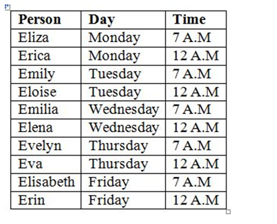 Eloise does not have exam on any one of the days after Emilia. Emily does not have exam on any of the days before Eliza. Evelyn does not have exam on any of the days after Elisabeth. Erica has exam immediately before Emily. Evelyn does not have exam at 12.00 A.M. Only three people have exam between Eliza and Emilia. The number of people who have exam between Eliza and Eloise is same as the number of people who have exam between Elena and Elisabeth. Only two people have exam between Evelyn and Erin. Neither Emilia nor Eliza does not have exam on Friday. Emily has exam on Tuesday at 07.00 A.M. Elisabeth does not have exam at 12.00 AM. The one who has exam at 07.00 A.M. immediately before Erin. Eloise has exam immediately after the day of one who has exam on Monday.