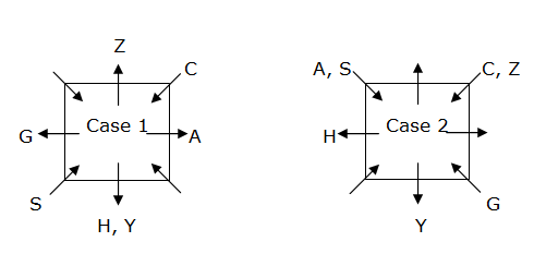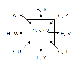 Eight persons-A, B, C, D, E, F, G and H are sitting around a square table in such a way that four of them sit at four corners of the square while four sit in the middle of each of the four sides. The ones who sit at four corners of the sides face center of the table while those who sit in the middle of the sides outside. Each of them likes different cartoon characters, viz. R, S, T, U, V, W, Z and Y, but not necessarily in the same order.