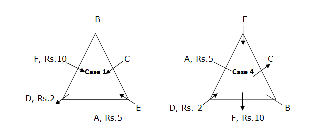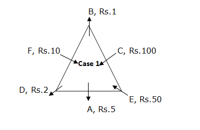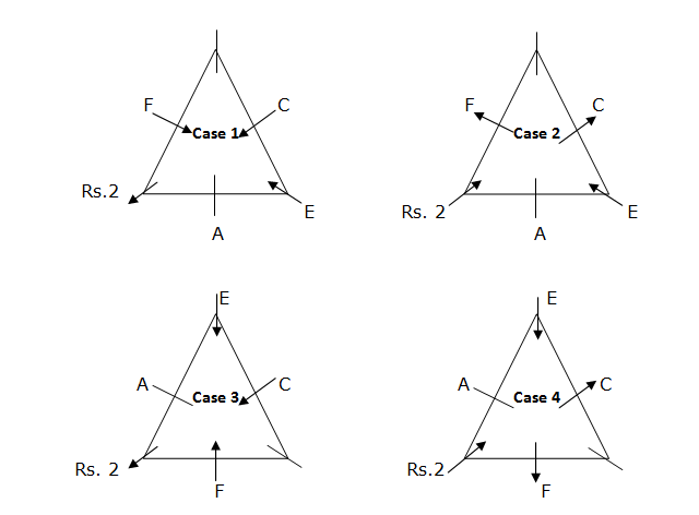 Six persons-A, B, C, D, E and F are sitting in a equated triangular table. Three of them sit at the corner of the table and three of them are sits at the middle of the side. Some of them facing center and some of them are facing outward of the table. Each of them likes different amount of coins, viz. Rs.1, Rs.2, Rs.5, Rs.10, Rs.50 and Rs.100, but not necessarily in the same order.