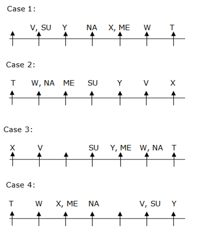 Seven friends-S, T, U, V, W, X and Y are sitting in a straight line facing north. Each of them likes different lakes, OS, HI, GZ, ME, DE, SU and NA, but not necessarily in the same order.