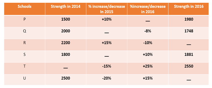 The following table represents strength of six different school in 2014 and 2016 and percentage increase/decrease in 2015 and 2016. Some data are missing.