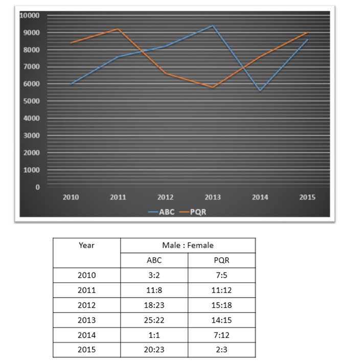 - Find the respective ratio of total number of males in ABC in 2010 and 2011 together and total number of females in PQR in 2012 and 2013 together.
