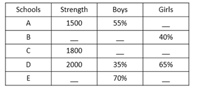 The following table represents strength of five different schools and the percentage of boys and girls in those schools.