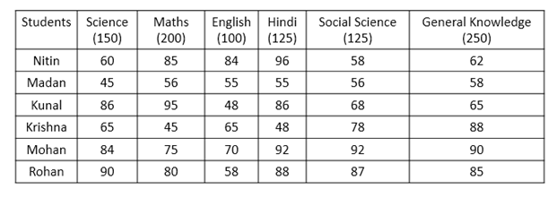 The following table represents percentage of marks obtained by six different students in six different subjects and maximum marks of each subject.