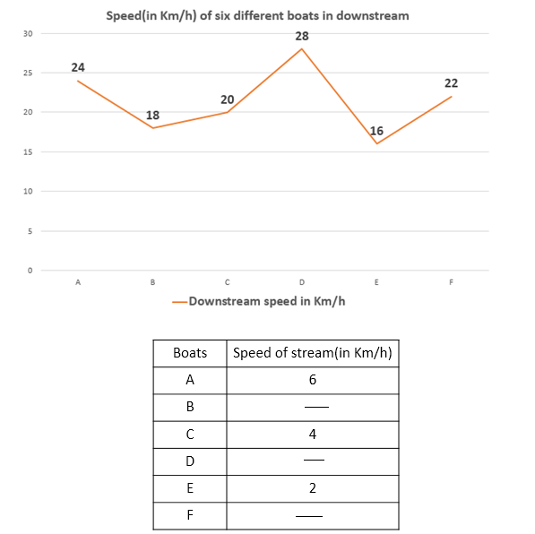 9. Find the difference between the time taken by boat C to travel 80 km downstream and time taken by boat E to travel 84 km upstream.
