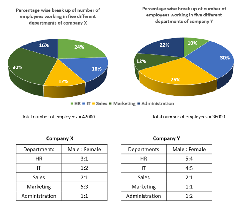 - Find the sum of total number of female employees of company X in HR and IT and total number of female employees of company Y in Sales, Marketing and Administration.