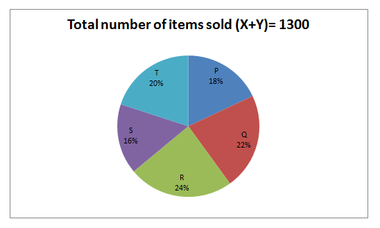 The following pie chart shows the total no of items sold by five different shops P, Q, R, S and T in a particular month. They sell two different items x and y.