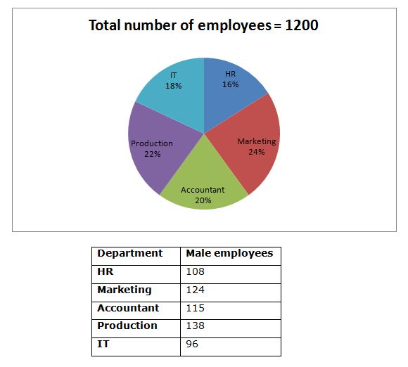 Following pie chart shows the percentage wise distribution of employees working in various departments and the table shows the total number of male among them.