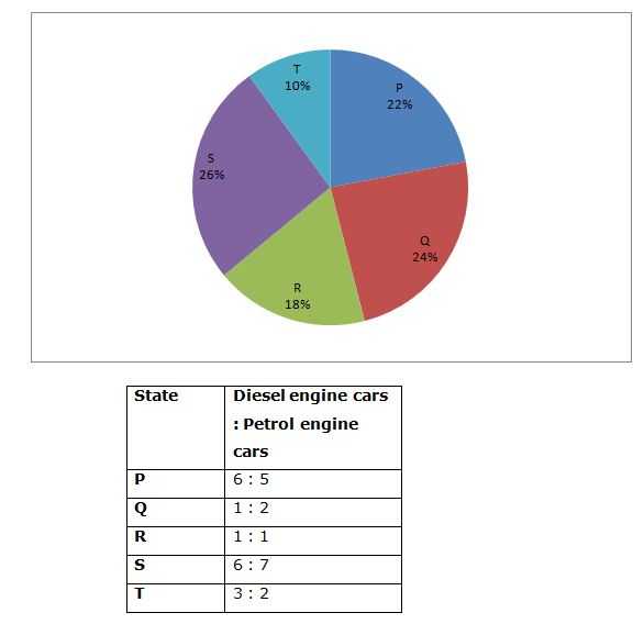 Following pie chart shows the percentage wise distribution of cars in 5 different states and the table shows the ratio of diesel engine cars and petrol engine cars.