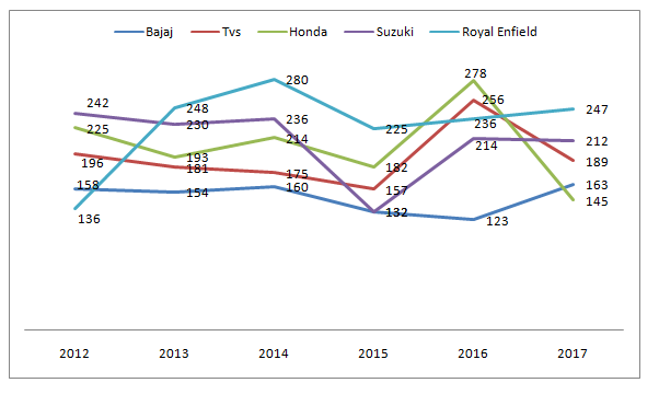 Following line graph shows the annual sales (in lakhs) of two wheelers of five different companies in India in the year 2012 to 2017.