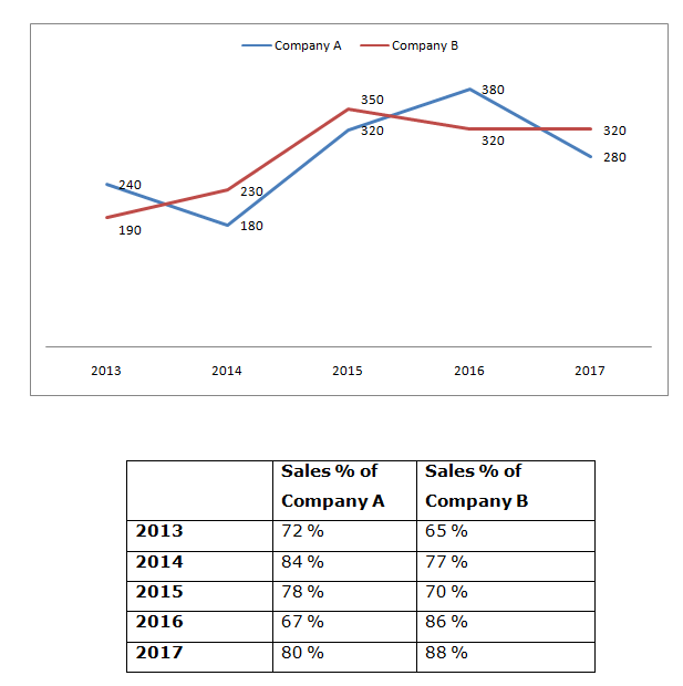 1. Find the difference between the total sales of company A in the year 2014 and 2017 together to that of total sales of company B in the year 2015 and 2016 together?