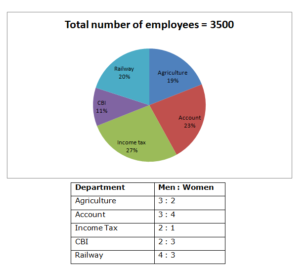 Following pie chart shows the total number of employees working in different government department in a certain state and the table shows the ratio of male and female among them.