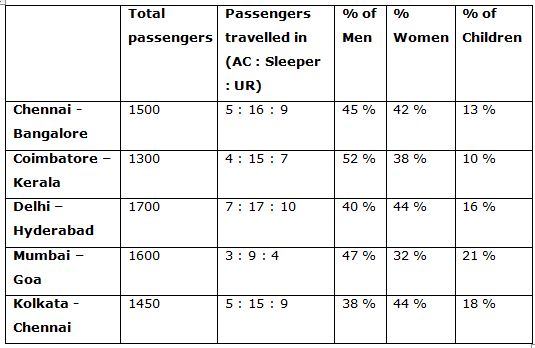 Following table shows the total number of passengers travelled in different trains and the ratio of total number of passengers travelled in different coaches and the percentage of male, female and children travelled in the train also given.