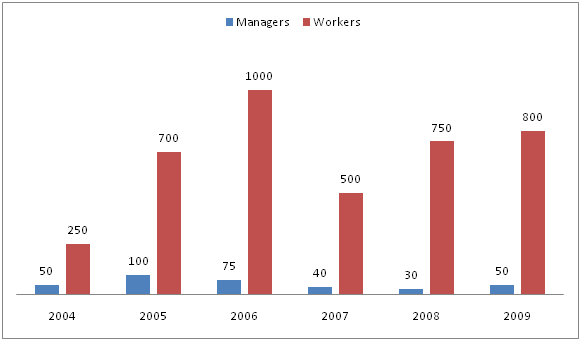 The following bar graph represents the number of employees (managers and workers) working in a company and the table shows the ratio of male and female in 6 different years.