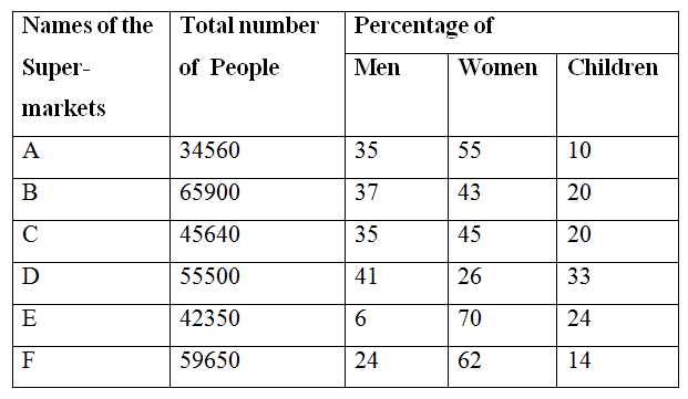Number of people visiting six different Super-markets and the percentage of Men, Women and Children visiting those Super-markets