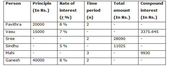 The table below shows the sum invested by different person, rate of interest, time period, total amount they received and the compound interest they received at the end. Some data’s are missing.