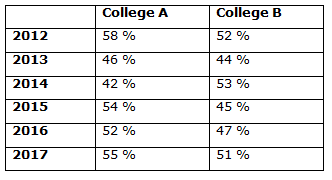 The following table shows the percentage of total number of boys passed in the examination out of the total number of students passed from two different colleges in different years.
