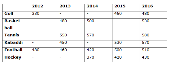 7) If the total amount spent on golf in the year 2012 and 2013 together is 750 crore and the total amount spent on Hockey in the year 2013 is 80 crore less than the total amount spent on Hockey in the year 2015, then find the average amount spent in the year 2013 for all given sports together?