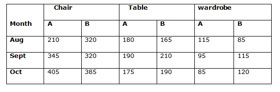 Let number of chairs, tables and wardrobes sold by A in August be 42x, 36x and 23x. Also, let chairs sold by A in August, September and October be 14y, 23y and 27y respectively.