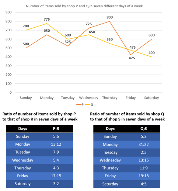- Find the respective ratio of number of items sold by shop R in Sunday, Monday and Tuesday together and the number of items sold by shop S in Wednesday, Thursday and Friday together.