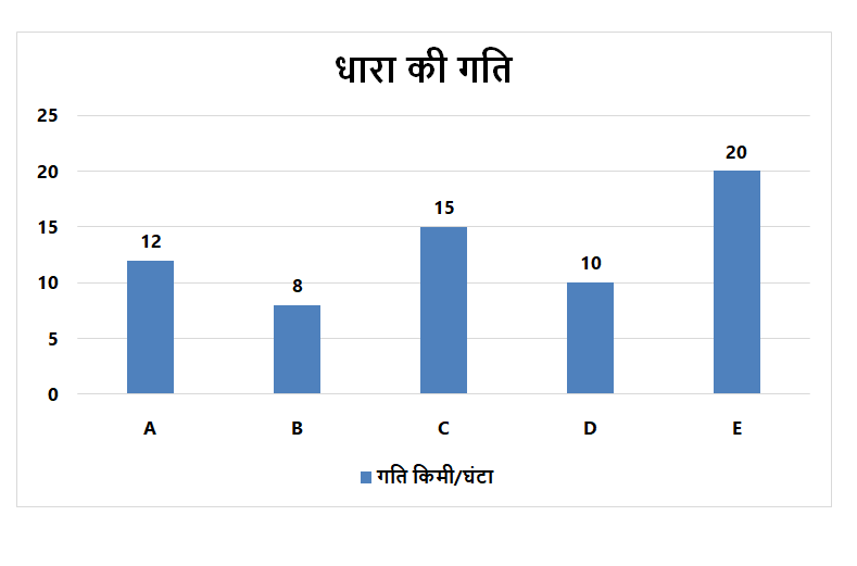 दिशा निर्देश (6 – 10): दो–लाइन ग्राफ पांच अलग–अलग नावों द्वारा यात्रा की गई दूरी को अनुप्रवाह और उर्ध्वप्रवाह दिखाते हैं और बार चार्ट धारा की गति को दर्शाता है।