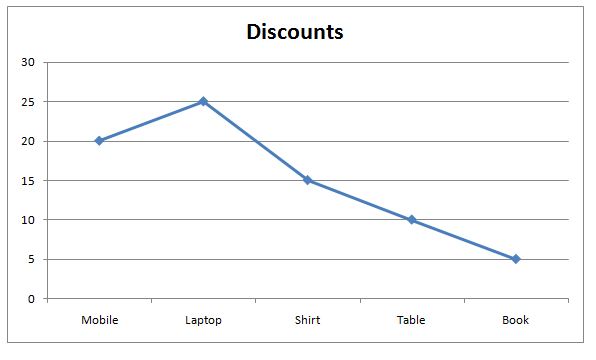 The given line graph shows the discount percent of five different items – Mobile, Laptop, Shirt, Table and Book.