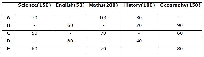 The given table shows the percentage of the marks in 5 different students in five different subjects. Maximum marks of subjects – Science, English, Maths, History and Geography is 150, 50, 200, 100 and 150 respectively.