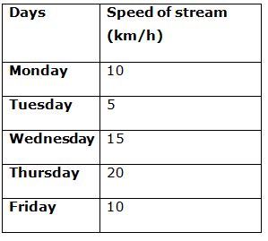 Table given below shows the speed (km/h) of stream on five different days of a week:
