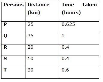 Pie charts given below shows the distribution (degree) of total distance covered (km) and per cent distribution of speed (km/h) of the cab for five different persons P, Q, R, S and T respectively.