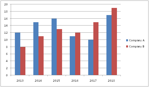 The following bar graph shows the total number of items (In lakhs) produced by two different companies in 6 different years.