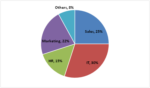 The following pie chart represents percentage wise distribution of number of employees working in different departments of an organisation in the year 2017.