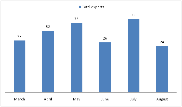 The following bar graph shows total exports of India (In billion dollars) in different months in the year 2017.