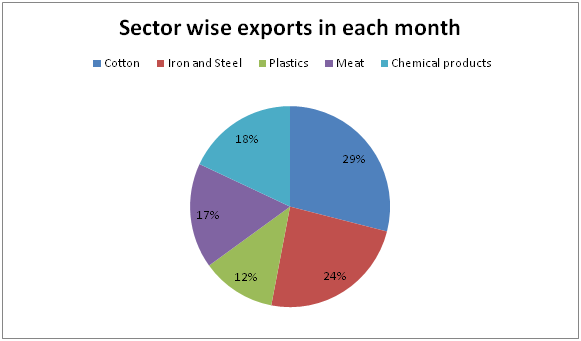 10) Total exports of Cotton and Meat in the month of March and August together is approximately what percentage more/less than the total exports of Iron and Steel and Chemical products in the month of April and June together?