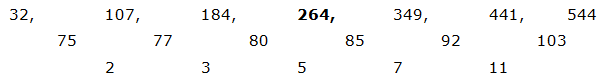 4) 32, 107, 184, 262, 349, 441, 544