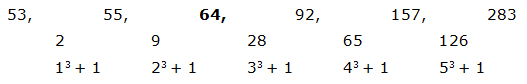 The difference is, 13 + 1, 23 + 1, 33 + 1, 43 + 1, 53 + 1,….