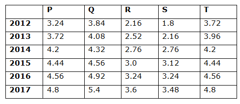 8) Find the ratio between the total amountsearned by P, Q and R in the years 2012, 2014 and 2016 together to that of total amount earned by R, S and T in the years 2013, 2015 and 2017 together?