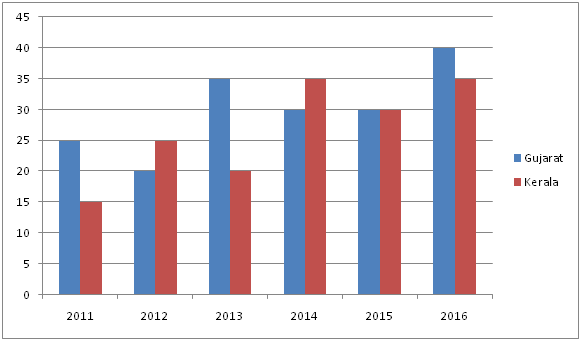 8) If the population of Gujarat in the year 2014 was 5.6 lakhs and the population of Kerala in the year 2014 was 4 lakhs, then find the ratio of population of Gujarat to that of Kerala in the year 2016?