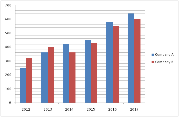 The following bar graph shows the number of projects handled by 2 different companies in 6 different years.