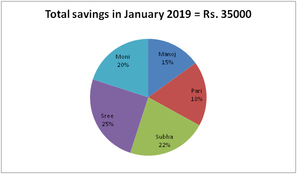 The following pie chart -1 shows the percentage distribution of savings of 5 different friends in January 2019 and pie chart – 2 shows the percentage distribution of savings of 5 friends in February 2019.