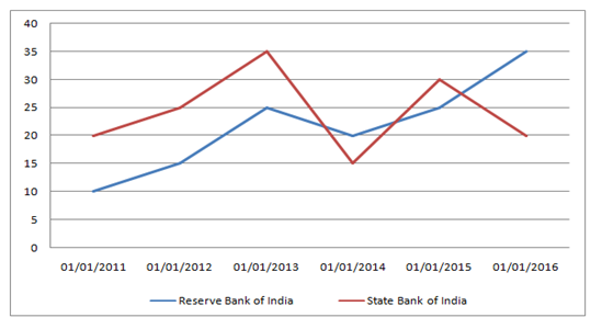 Average number of staffs in Reserve Bank of India = (10 + 15 + 25 + 20 + 25 + 35)/6