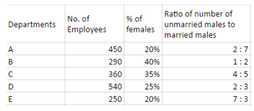 The table shows the number of employees in 5 departments – A, B, C, D and E in a company, the percentage of females in each department and the ratio of number of males who are unmarried to married.