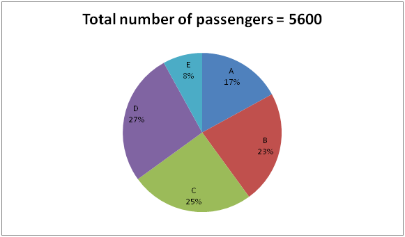 The following pie chart shows the total number of passengers in 5 different trains (A, B, C, D and E).