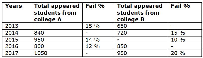 The following table shows the total number of students appeared for the examination from College A and B and the percentage of failed students among them in 5 different years. Some values are missing here.