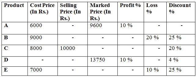 The following table shows the cost price, selling price, marked price, profit and loss % and discount % for the different products.