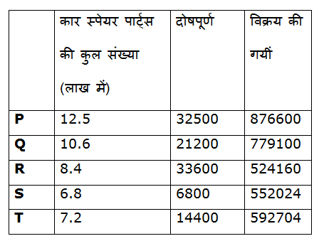 निम्न तालिका दर्शाती है कि एक निश्चित वर्ष में पांच अलग-अलग कंपनियों द्वारा निर्मित कार स्पेयर पार्ट्स की कुल संख्या (लाख में) और दोषपूर्ण और विक्रय की गयीं वस्तुओं की कुल संख्या दी गयी है।