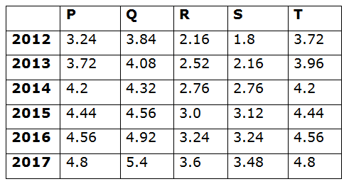 8) वर्ष 2012, 2014 और 2016 में एक साथ P, Q और R द्वारा अर्जित की गयी कुल राशि,वर्ष 2013, 2015 और 2017 में एक साथ R, S और T द्वारा अर्जित की गई कुल राशि के बीच का अनुपात ज्ञात कीजिए?