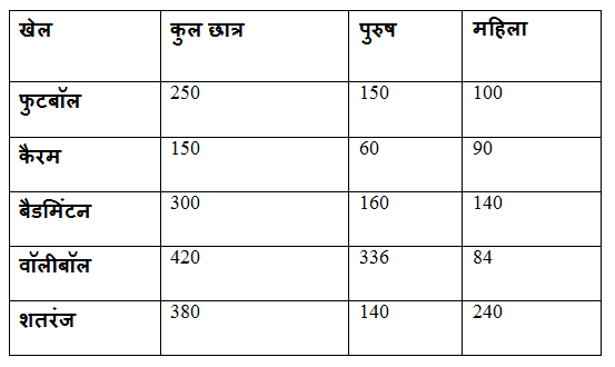 एक कॉलेज में 1500 छात्र हैं। सांस्कृतिक कार्यक्रम में सभी छात्र विभिन्न खेलों में भाग ले रहे थे। खेल फुटबॉल, कैरम, वॉलीबॉल, बैडमिंटन, शतरंज हैं। पुरुष और महिला का अनुपात 8: 7 है। फुटबॉल में भाग लेने वाले पुरुषों का प्रतिशत फुटबॉल में भाग लेने वाले कुल छात्रों का 60% है। कैरम में भाग लेने वाले कुल पुरुष कैरम में शामिल कुल महिलाओं के दो-तिहाई हैं। फुटबॉल में भाग लेने वाली कुल महिलाएं 100 हैं। कैरम और बैडमिंटन में भाग लेने वाले कुल छात्रों का अनुपात 1: 2 है। कैरम में भाग लेने वाले छात्रों की कुल संख्या, फुटबॉल में भाग लेने वाले छात्रों की कुल संख्या 100 से कम है। वॉलीबॉल में भाग लेने वाली महिलाओं की कुल संख्या वॉलीबॉल में कुल छात्रों का 20% है। बैडमिंटन में भाग लेने वाली कुल महिलाओं की तुलना में कैरम में 10 अधिक छात्रों ने भाग लिया है। वॉलीबॉल में भाग लेने वाले कुल पुरुषों की संख्या 336 है। शतरंज में भाग लेने वाली कुल महिलाएं शतरंज में भाग लेने वाले कुल पुरुषों की तुलना में 100 अधिक हैं।