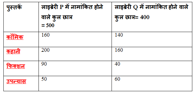 दो अलग-अलग पुस्तकालयों P और Q में सदस्यता के लिए नामांकित छात्रों की कुल संख्या 900 है। विभिन्न प्रकार की किताबें पुस्तकालय में हैं। किताबें कॉमिक, कहानी, फिक्शन और उपन्यास से संबंधित किताबें हैं। पुस्तकालय P और पुस्तकालय Q में सदस्यता के लिए नामांकित छात्रों की कुल संख्या 5: 4 के अनुपात में है। पुस्तकालय P में, 32% छात्रों ने कॉमिक से संबंधित किताबें ली हैं और 18% छात्रों ने फिक्शन से संबंधित किताबें ली हैं। पुस्तकालय P से कहानी संबंधी पुस्तकों को लेने वाले छात्रों की कुल संख्या, दोनों पुस्तकालयों में कहानी संबंधी पुस्तकों को लेने वाले छात्रों की कुल संख्या के दो तिहाई से 40 कम है। पुस्तकालय Q से कॉमिक से संबंधित पुस्तकें लेने वाले छात्रों की कुल संख्या, पुस्तकालय P से कॉमिक से संबंधित पुस्तकें लेने वाले छात्रों की कुल संख्या की ⅞ है। दोनों पुस्तकालयों से कहानी की किताबें कुल 360 छात्रों ने ली हैं। पुस्तकालय Q से उपन्यास लेने वाले छात्रों की कुल संख्या , पुस्तकालय Q से फिक्शन संबंधी पुस्तकें लेने वाले छात्रों की संख्या से 20 अधिक है ।