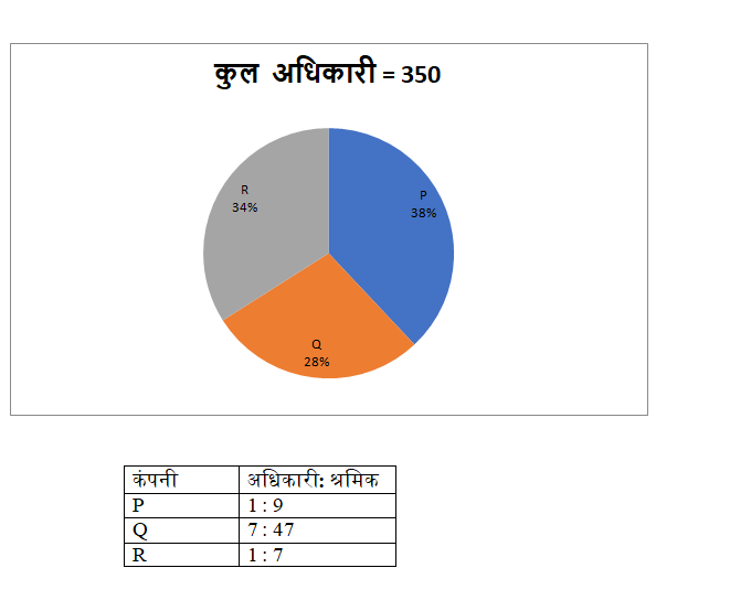 निम्नलिखित पाई चार्ट 3 अलग-अलग कंपनियों में अधिकारियों की कुल संख्या को दर्शाता है और तालिका दी गयी उन्हीं कंपनियों में अधिकारियों की कुल संख्या से श्रमिकों की कुल संख्या का अनुपात दर्शाती हैं।